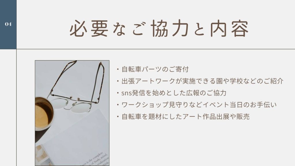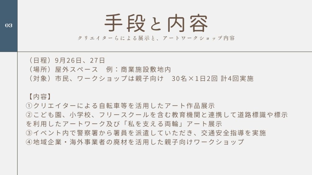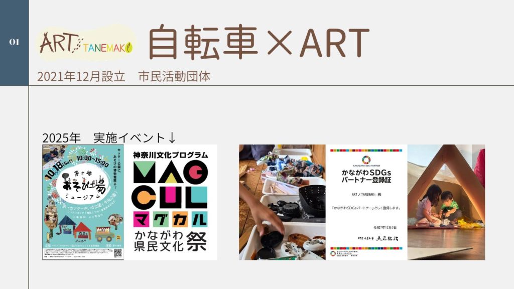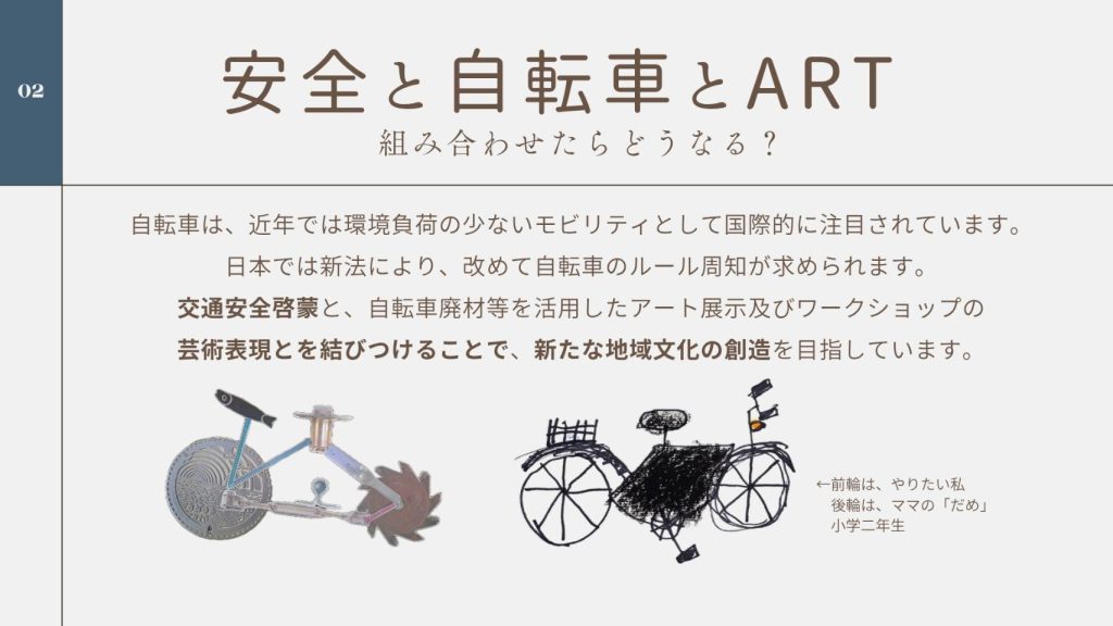 交通安全啓蒙と、自転車廃材等を活用したアート展示及びワークショップの芸術表現とを結びつけることで、新たな地域文化の創造を目指しています。